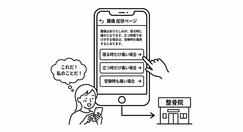 このようなワードを検索するユーザーは、悩みが深く具体的であるため、「改善したい」という意欲が非常に高い「顕在層」です。ピンポイントな悩みにズバリ答えるブログを掲載することで、「私の症状を分かってくれる!」という強い信頼が生まれ、トップページを見るだけのユーザーよりも圧倒的に高い確率で来院(成約)に直結します。